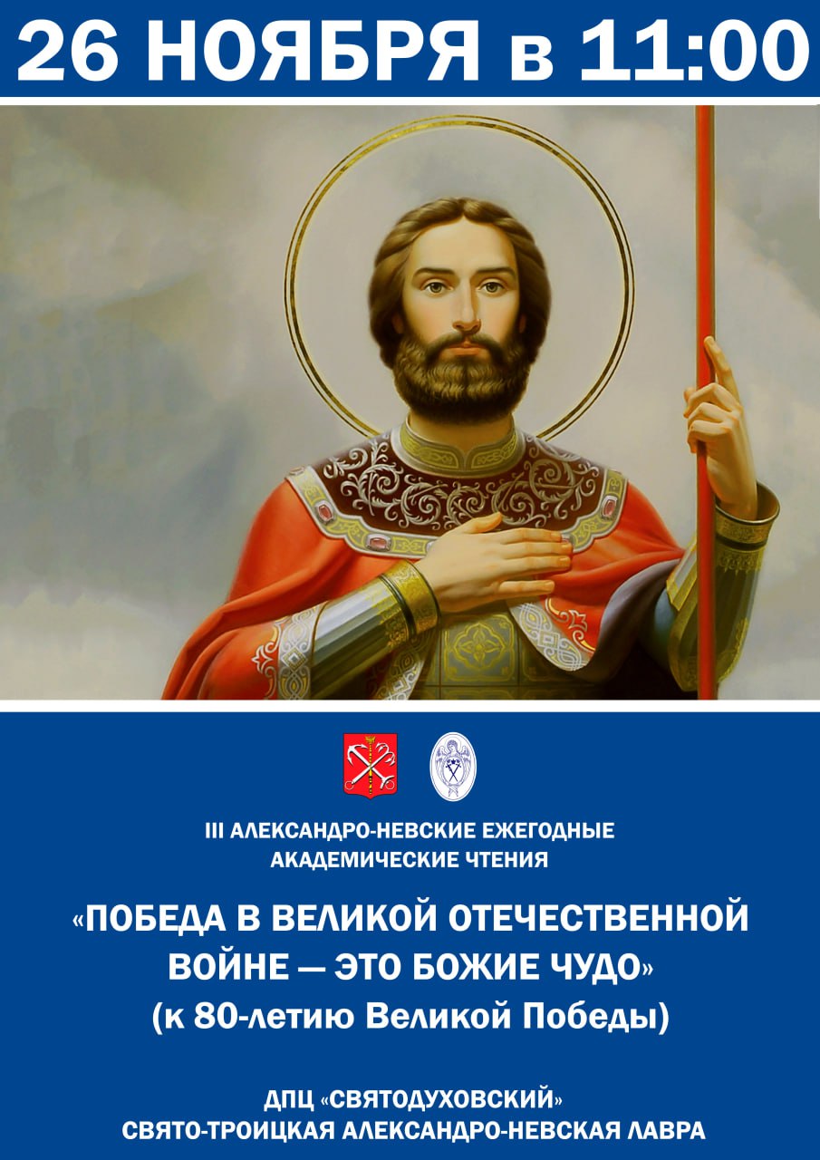 Санкт-Петербургской епархии и городского правительства. Тема этого года - "Победа в Великой Отечественной войне - это Божие чудо" (к 80-летию Великой Победы). В чтениях примут участие историки, богословы, руководство и преподаватели военных вузов Санкт-Петербурга