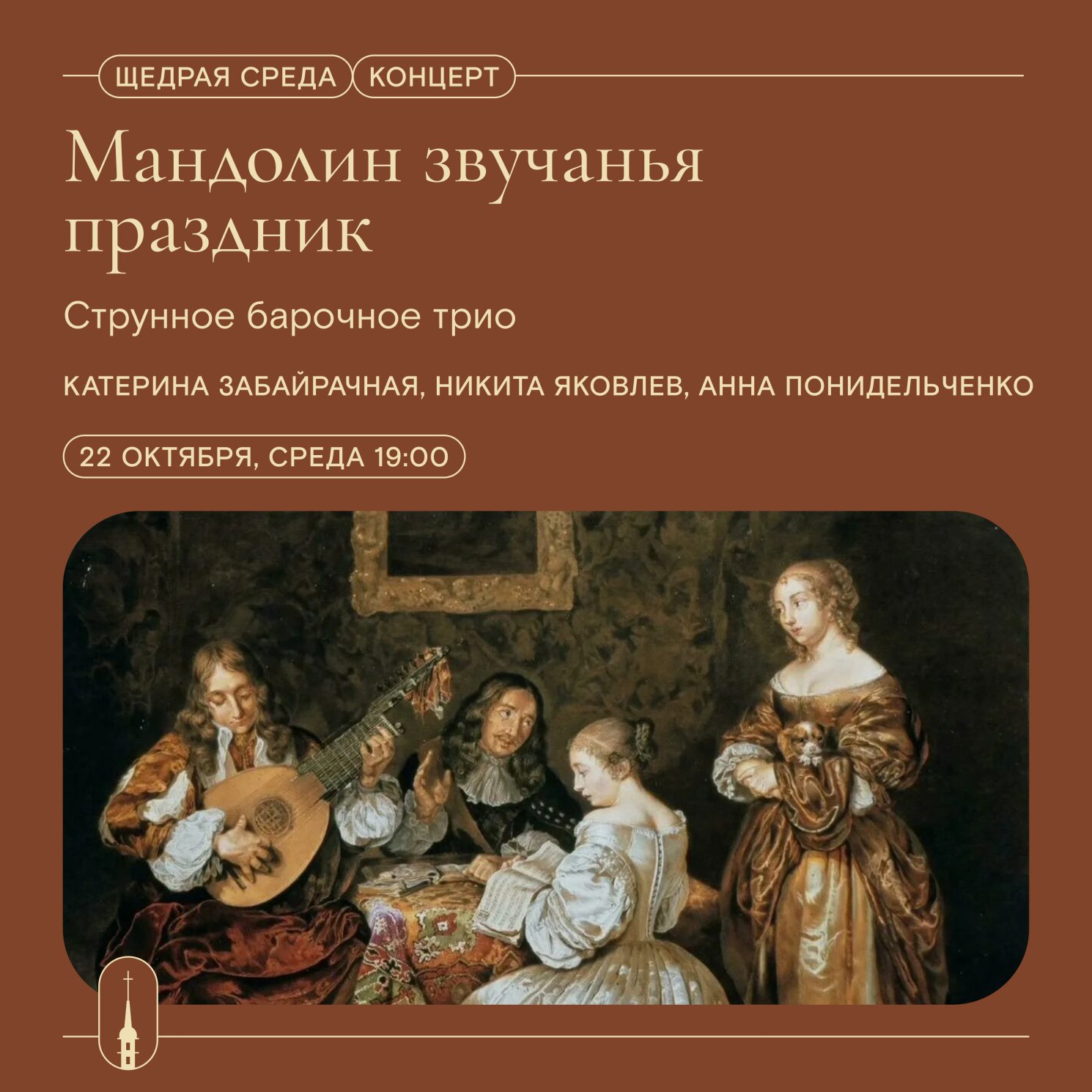 Прозвучат произведения Антонио Вивальди, Иоганна Себастьяна Баха, Николая Римского-Корсакова, Анатолия Лядова и Александра Бородина в исполнении струнного трио: Екатерина Забайрачная (барочная мандолина), Никита Яковлев (плекторный бас), Анна Понидельченко (мандола).