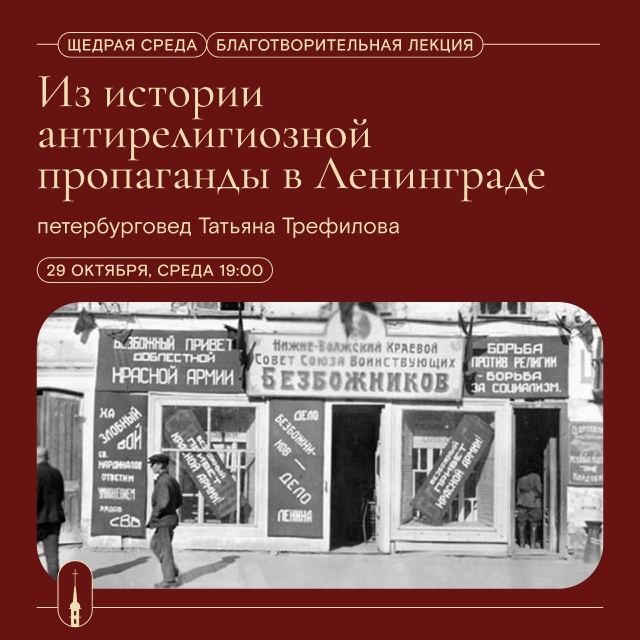 Лекция историка и петербурговеда Татьяны Трефиловой "Из истории антирелигиозной пропаганды в Ленинграде" пройдет 29 октября в рамках проекта "Щедрая среда", направленного на поддержку