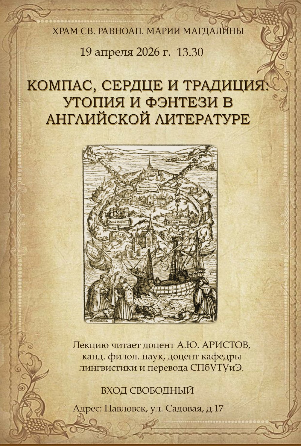 Лекция Алексея Аристова "Компас, сердце и традиция: утопия и фэнтези в английской литературе" состоится 19 апреля на приходе