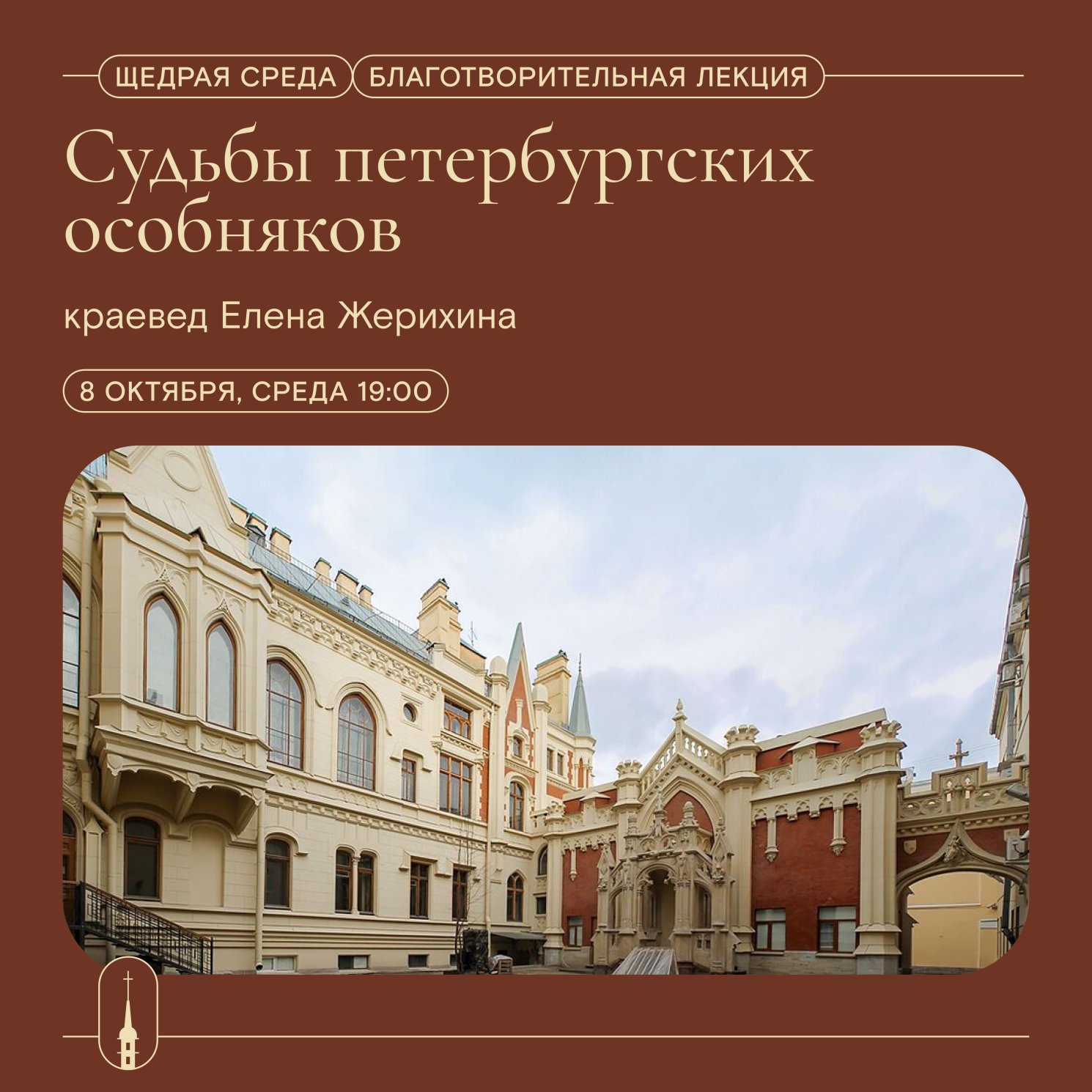 Лекция краеведа Елены Жерихиной "Судьбы петербургских особняков" состоится 8 октября в рамках проекта "Щедрая среда", направленного на поддержку