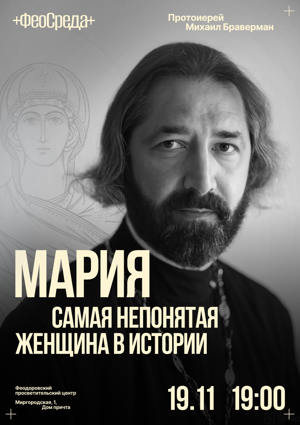 протоиереем Михаилом Браверманом, автором книги "Агни парфене" и художником, "Мария. Самая непонятая женщина в истории" пройдет 19 ноября в рамках проекта "Феосреда" в доме причта (просветительском центре)
