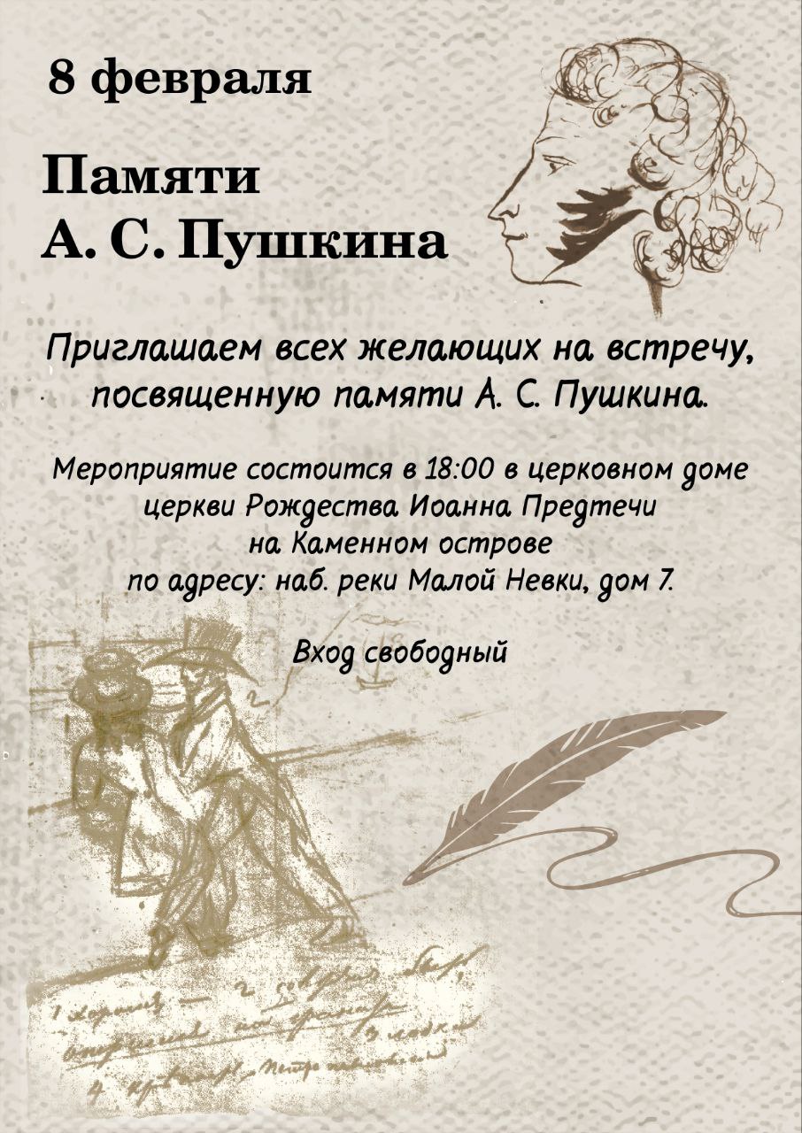Встреча, посвященная памяти Александра Пушкина, приуроченная ко дню его кончины, состоится 8 февраля в церковном доме